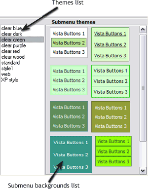 In the Themes toolbox you can choose submenu themes for web appearance. Click theme name to open it. The theme's available submenu's backgrounds will appear in the Submenu backgrounds list.