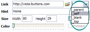 - Also, you can assign link target attributes for each button. This will define where a linked page will be opened in your Web-browser. For example "_blank" attribute will open the linked page in new browser window. Note that link target attribute act exactly like the Target attribute of the <a> tag in HTML. To set button link target attribute, just select the button and then either choose one of the predefined values from the "Link target attributes" list on the Properties toolbox or enter your own value (window/frame name, where the linked page should be opened). Learn more about link target attributes from the user guide.