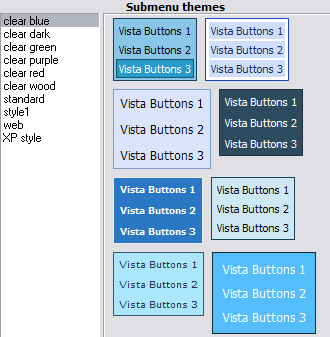 - Let's change the submenu theme. To do it just select theme you like in the submenus themes list on the Themes toolbox. Then you can browse this theme's submenu backgrounds. Note, that submenu backgrounds are previewable. You can look at their behavior while choosing. Just point mouse at it to know how submenu will react.